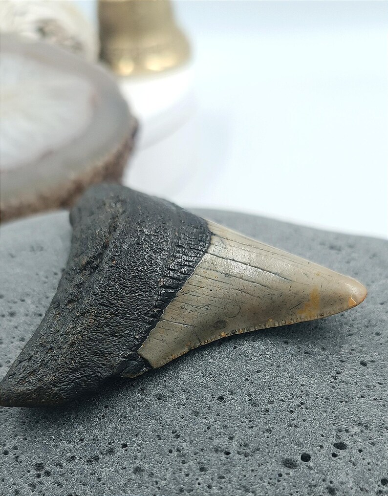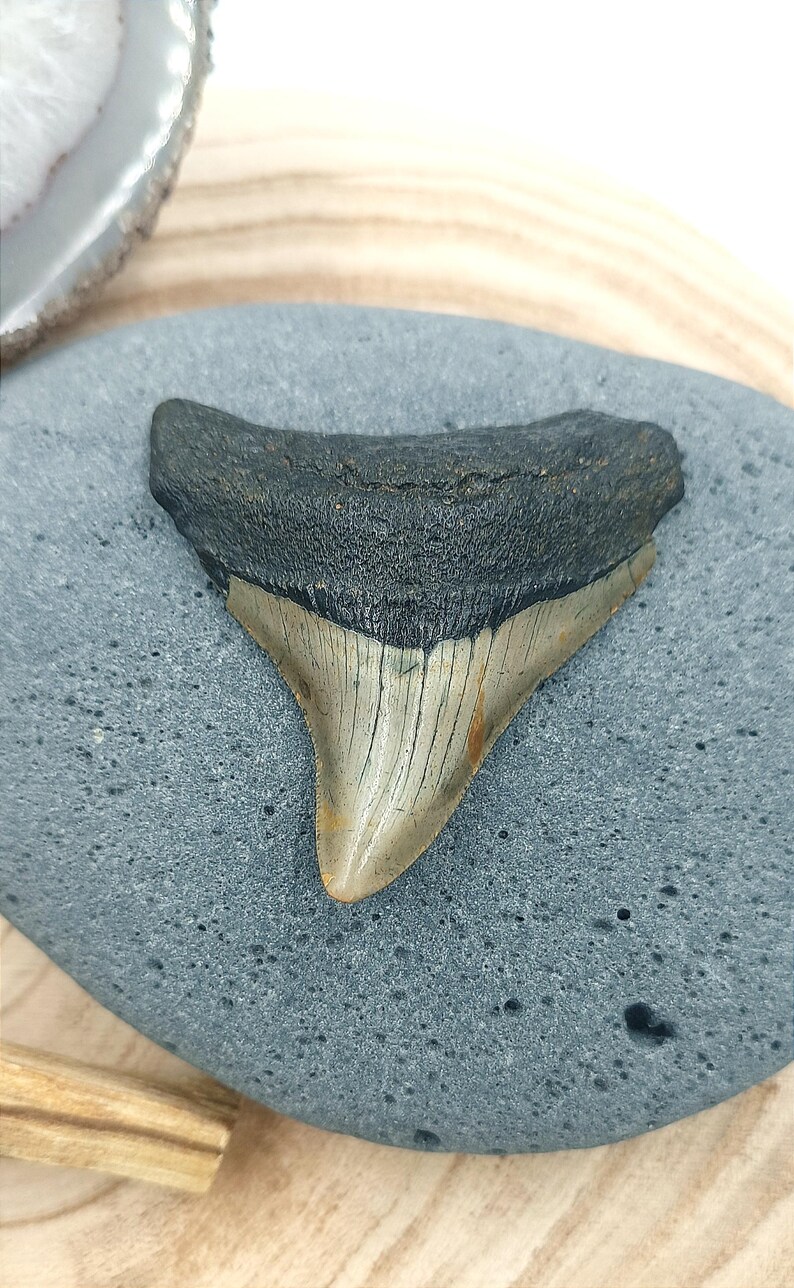 Cette dent de Mégalodon est un très beau spécimen, entier et bien conservé, épaisse et robuste, de couleur grise foncée, avec une jolie forme.