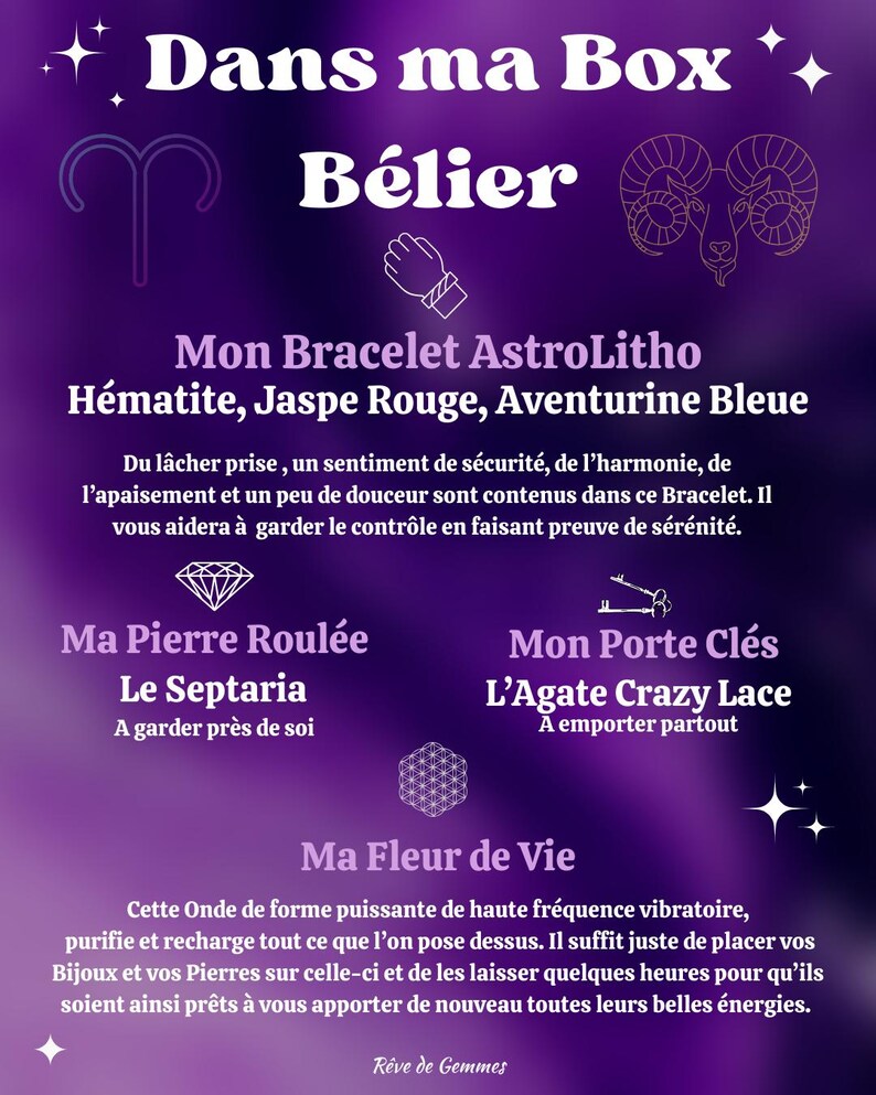 – Une Jolie Carte remplie d’informations spécifiques au signe du Bélier mais aussi des Pierres composant la Box et leur signification, ainsi qu’un Mantra à se répéter dès que besoin.