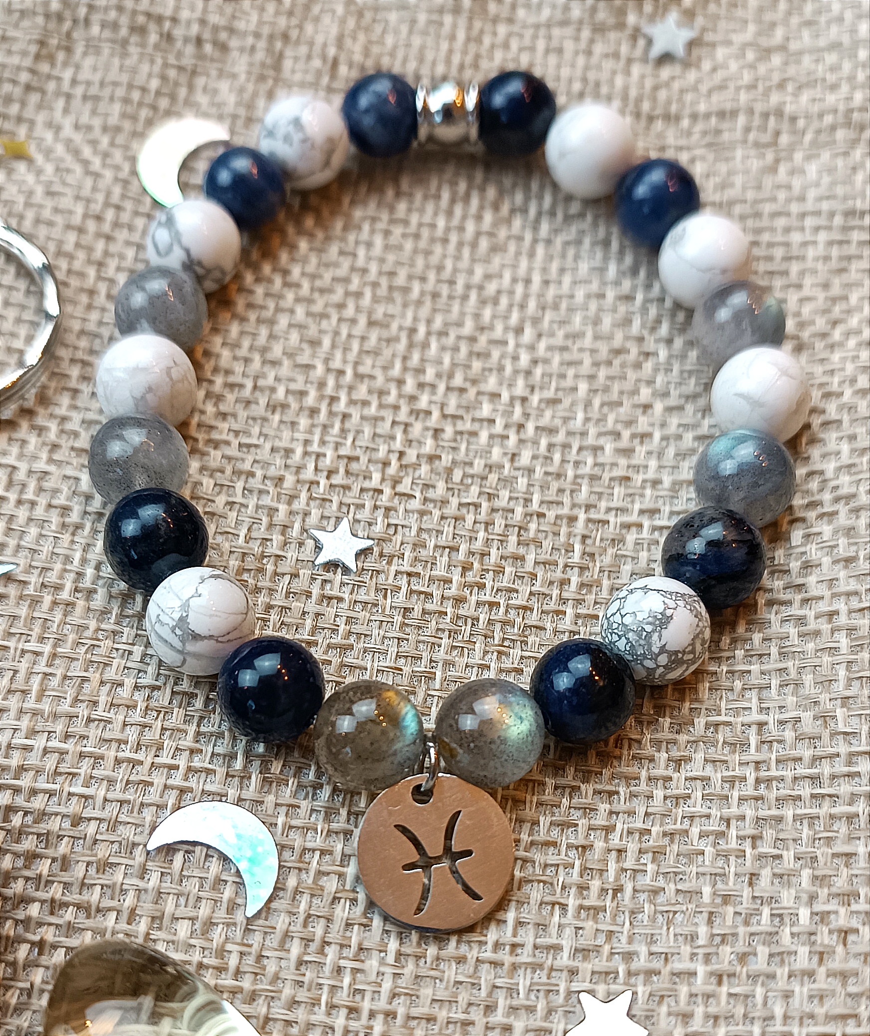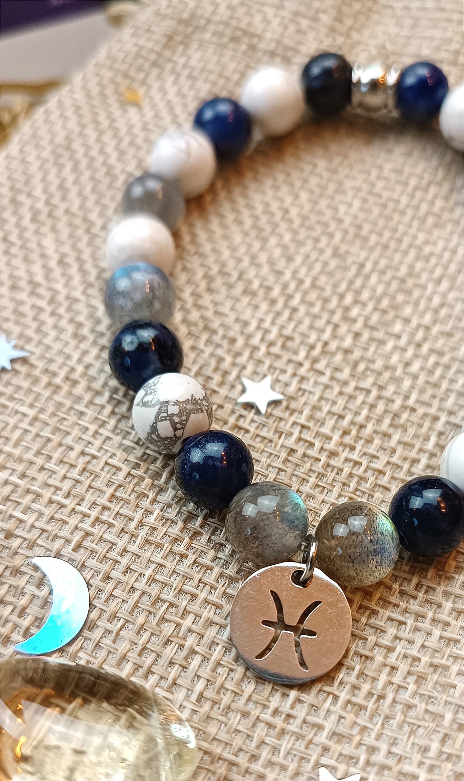 * Un bracelet composé de 3 Pierres différentes dont la synergie est adaptée à l’essence profonde du signe des Poissons ainsi que d’une jolie pampille estampillée de son symbole astrologique :