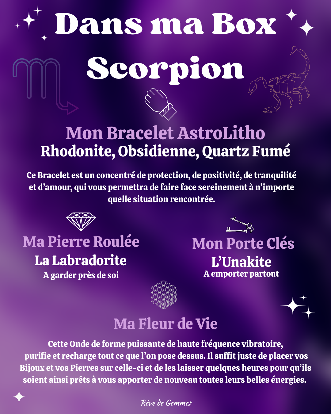 Une Jolie Carte remplie d’informations spécifiques au signe du Scorpion mais aussi des Pierres composant la Box et leur signification, ainsi qu’un Mantra à se répéter dès que besoin.