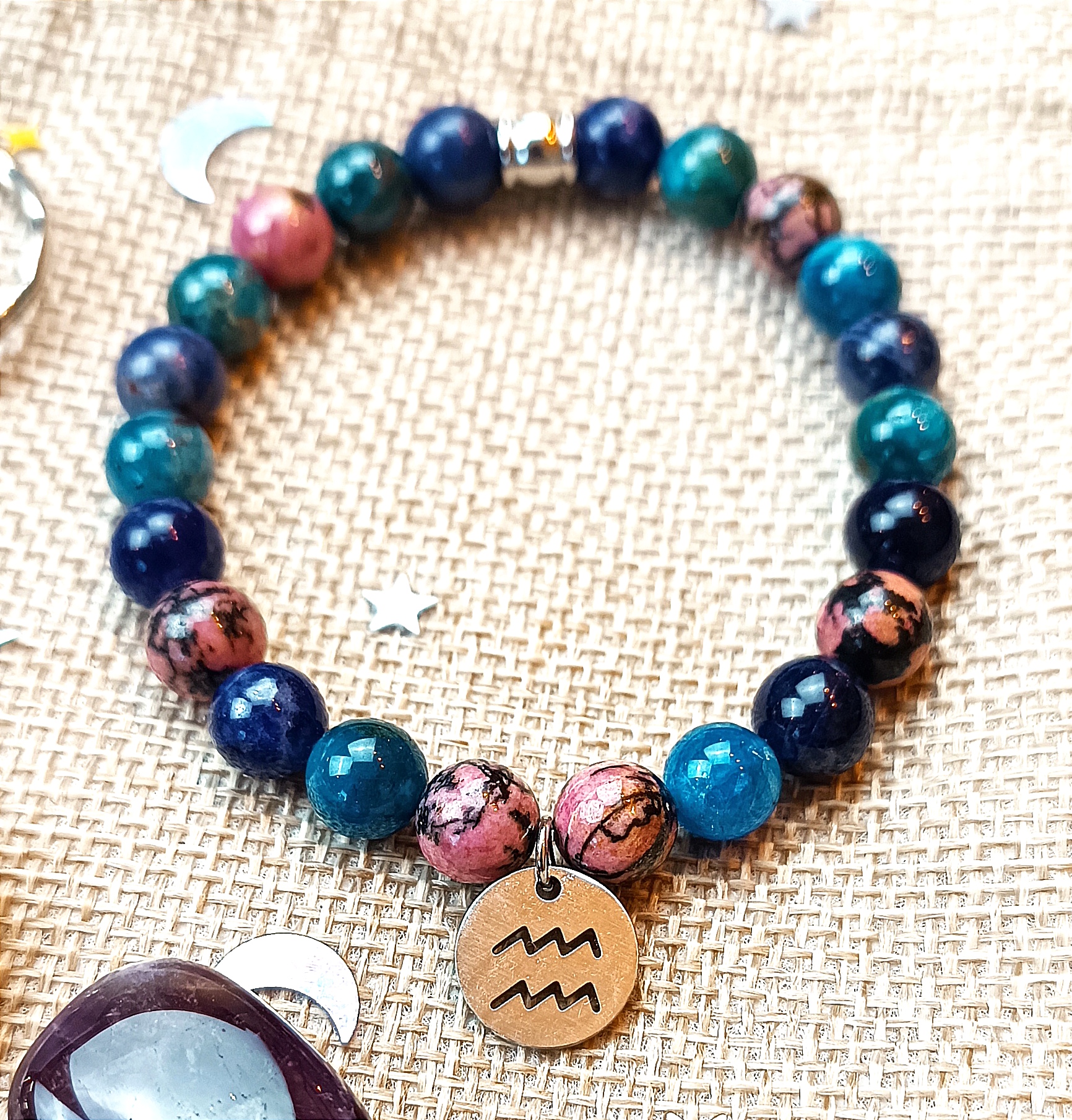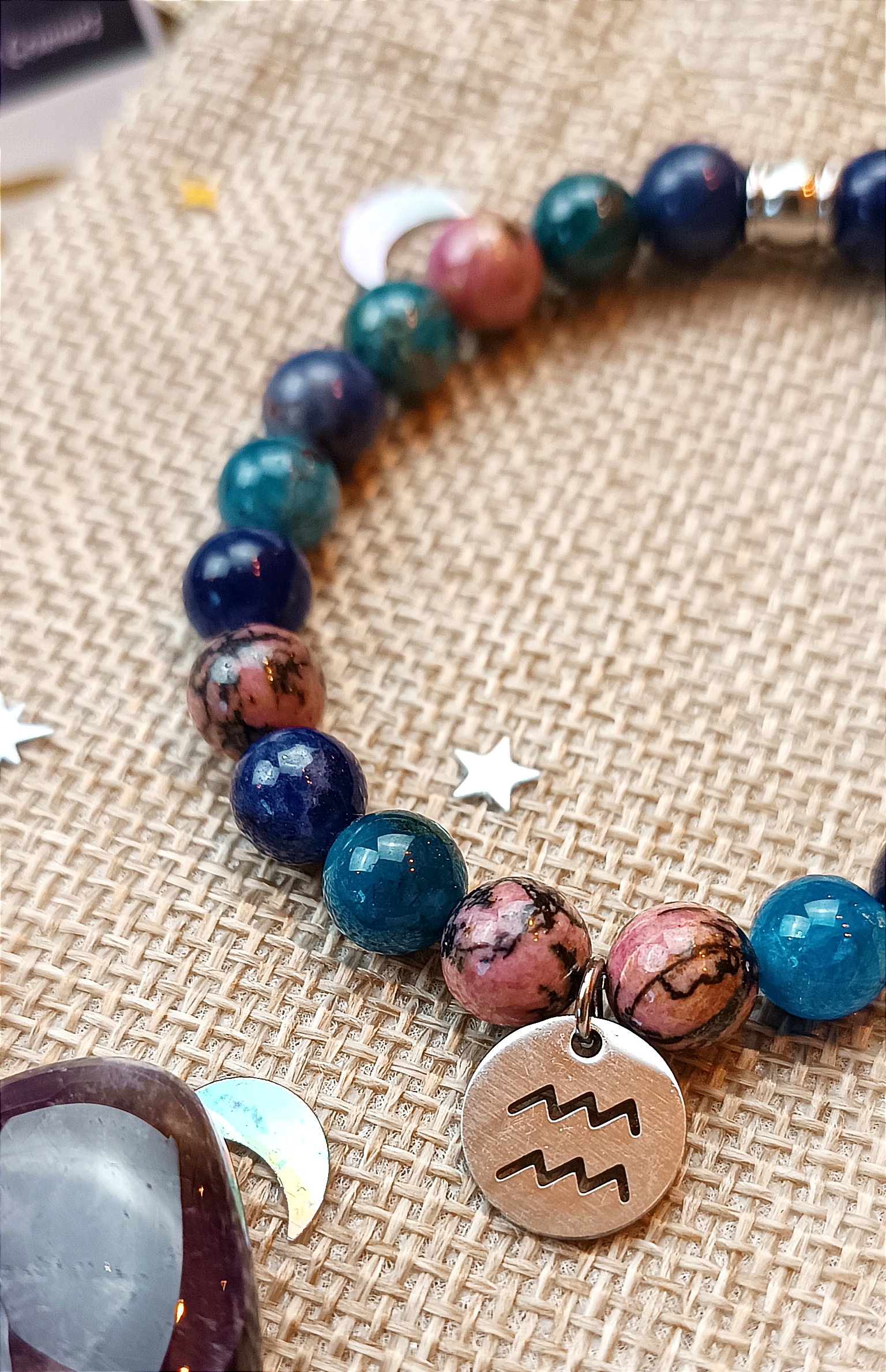 * Un bracelet composé de 3 Pierres différentes dont la synergie est adaptée à l’essence profonde du signe du Verseau ainsi que d’une jolie pampille estampillée de son symbole astrologique :