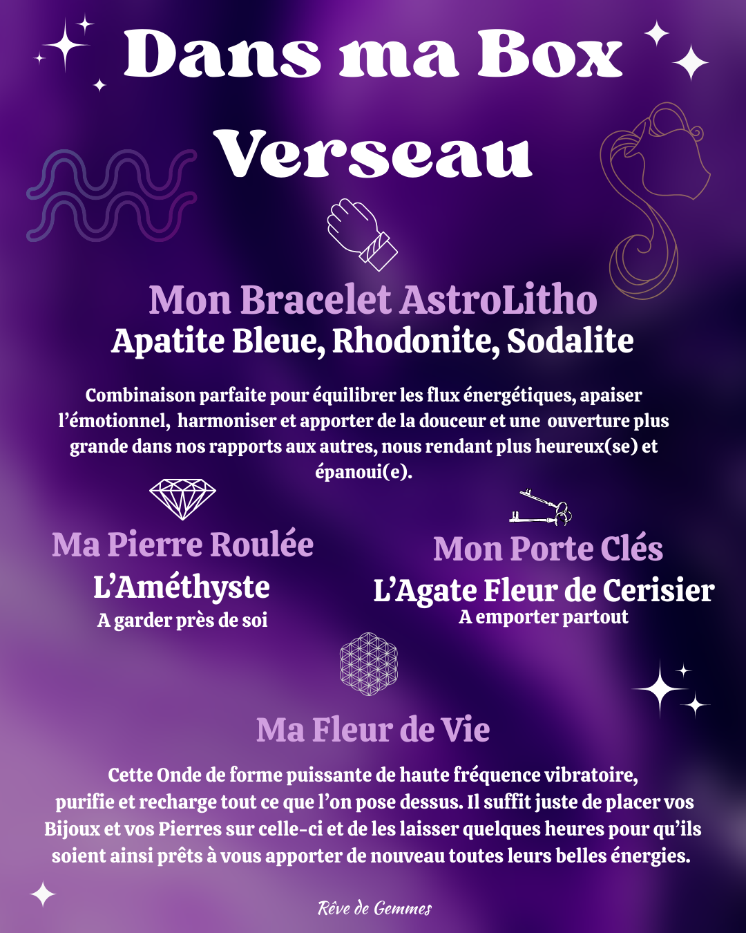 – Une Jolie Carte remplie d’informations spécifiques au signe du Verseau, mais aussi des Pierres composant la Box et leur signification, ainsi qu’un Mantra à se répéter dès que besoin.