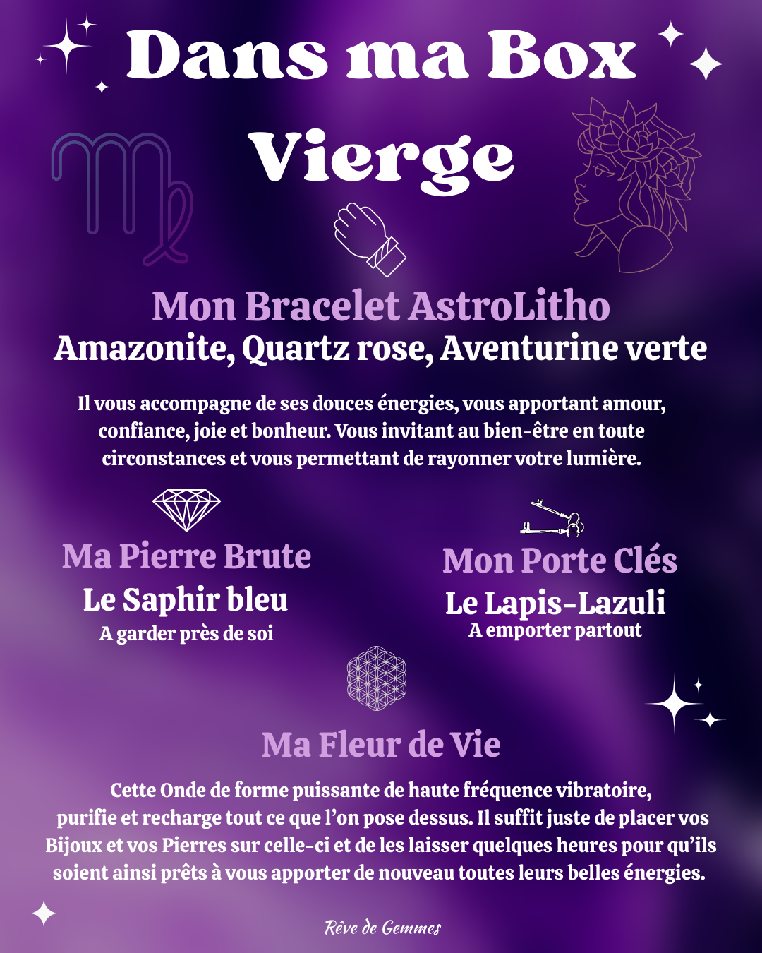 – Une Jolie Carte remplie d’informations spécifiques au signe de la Vierge, mais aussi des Pierres composant la Box et leur signification, ainsi qu’un Mantra à se répéter dès que besoin.