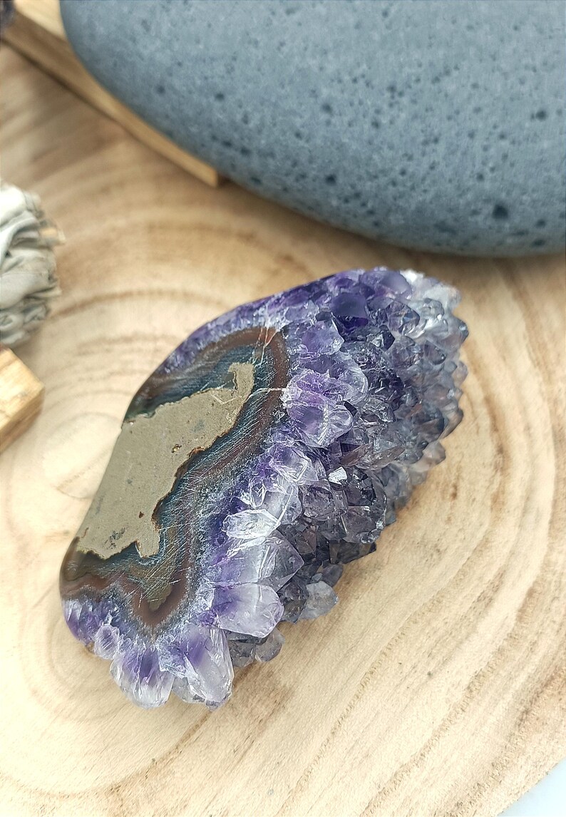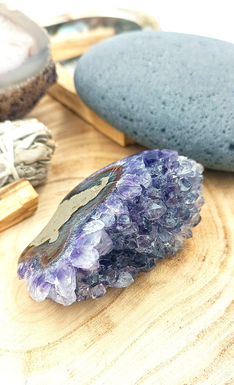 Pour la purification de votre Améthyste il existe plusieurs possibilités, en voici quelques une : fumigation ( palo santo, sauge blanche..), Druse, Géode, Géométrie sacrée …