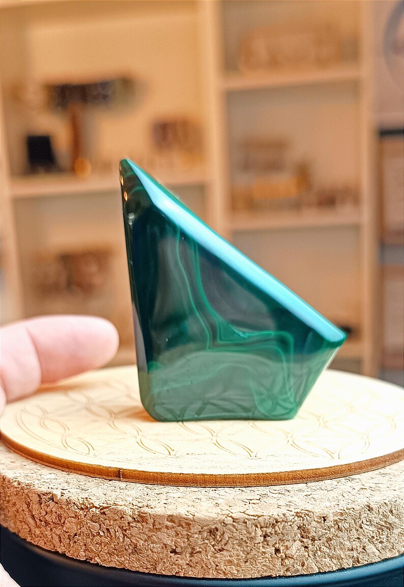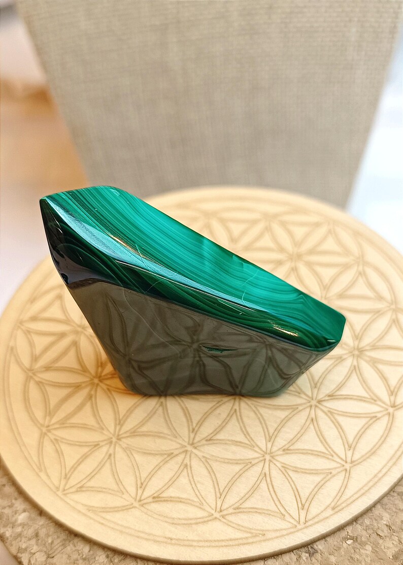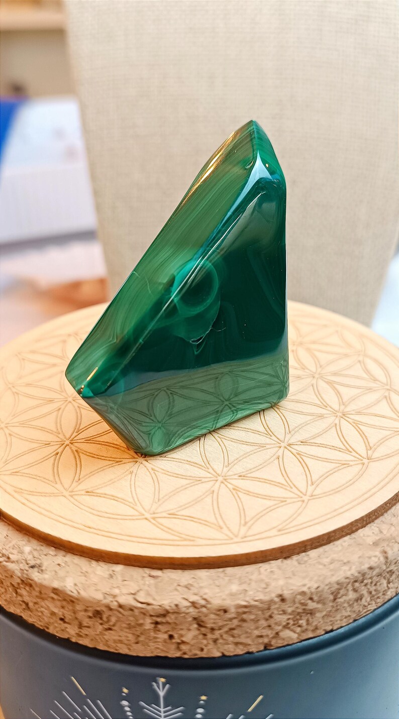 Les Formes libres en Malachite présentées sur le site sont douces, taillées, polies, de super qualité avec de très belles formes et couleurs, et se posent sur leur base.