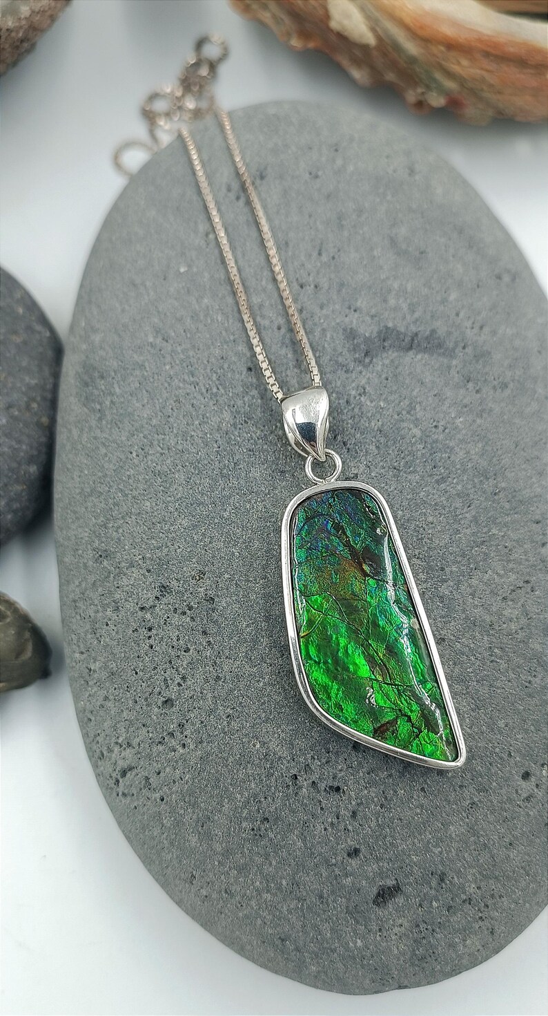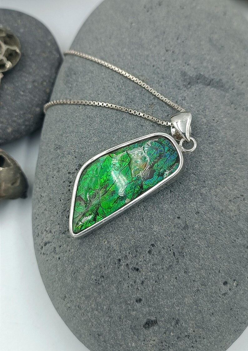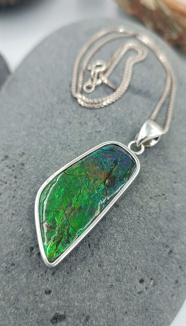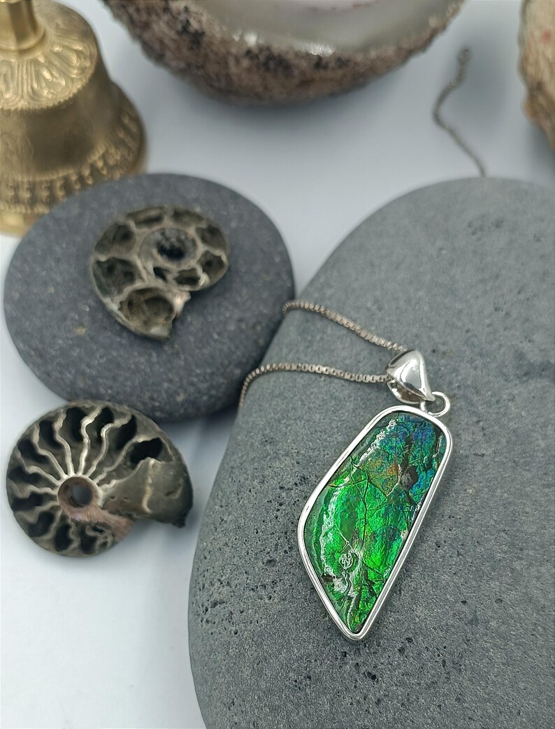 Magnifique Pendentif en Ammolite serti argent ( gemme rare, pierre organique, fossile, énergie positive, projets, chance, collier, original )