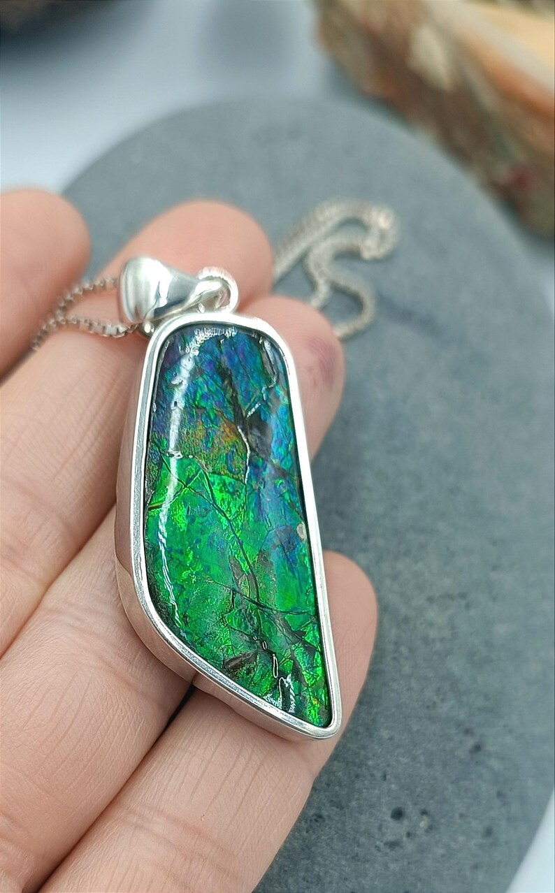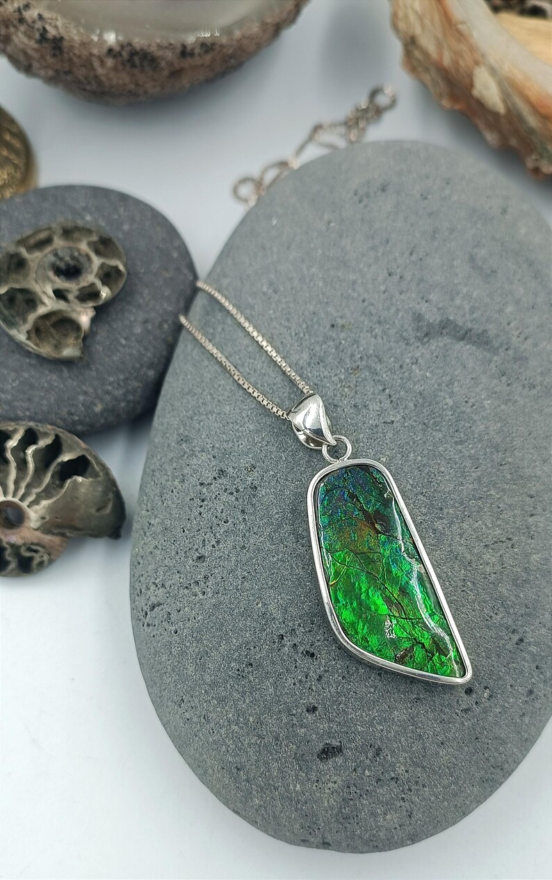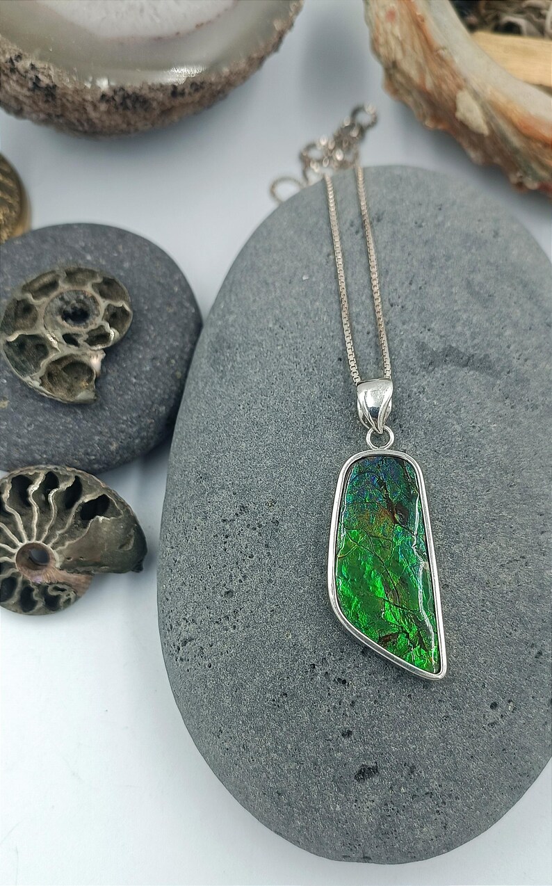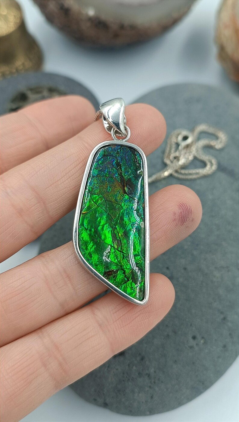Magnifique Pendentif en Ammolite serti argent ( gemme rare, pierre organique, fossile, énergie positive, projets, chance, collier, original )